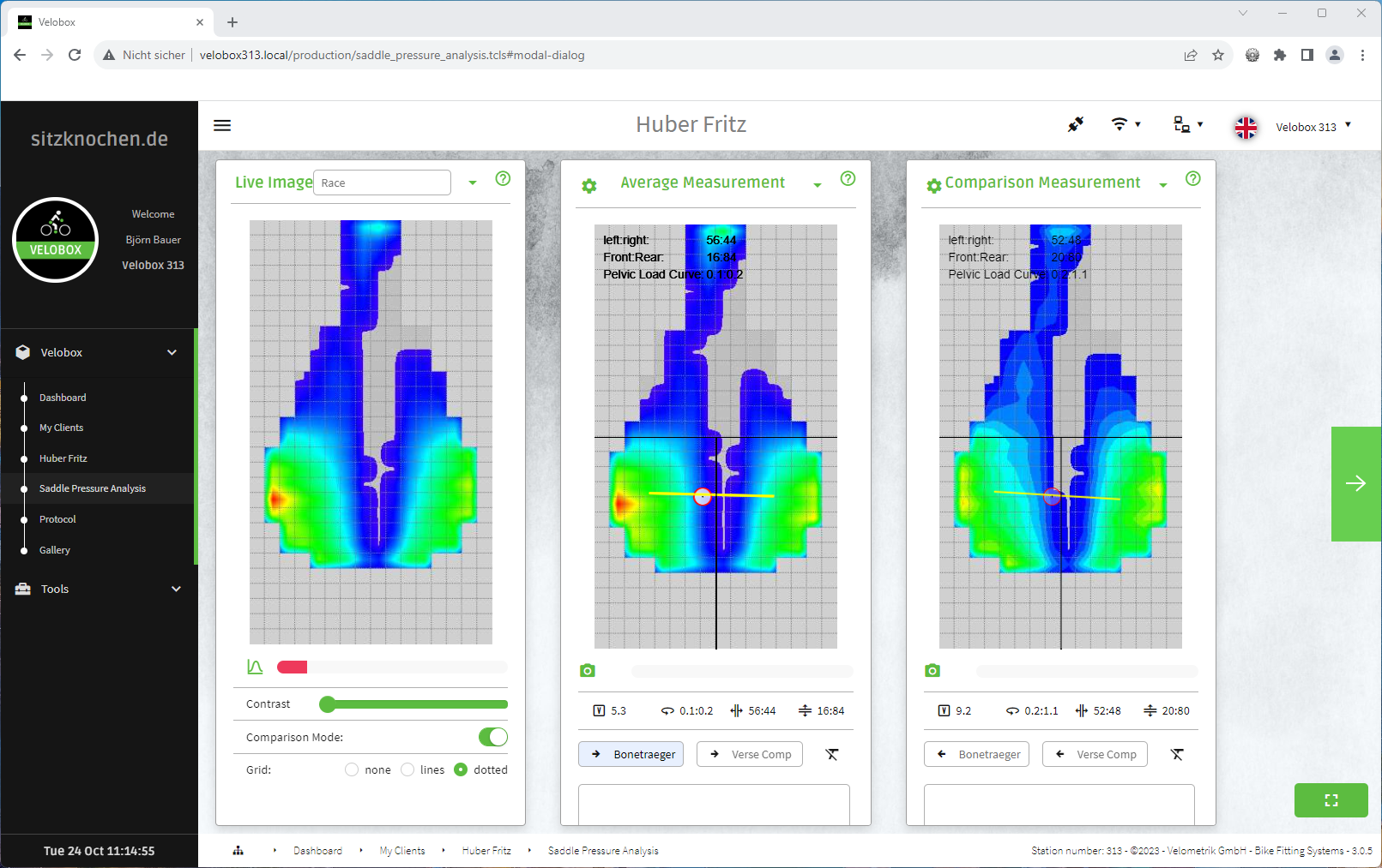 2. Echtzeit-Analyse Starte die Messung direkt in deinem Browser. Während dein Kunde pedaliert, liefert die lückenlose Sensormatrix sofort präzise Daten zur Druckverteilung, Beckenstabilität und Symmetrie – visualisiert in hochauflösenden 2D- und 3D-Grafiken.